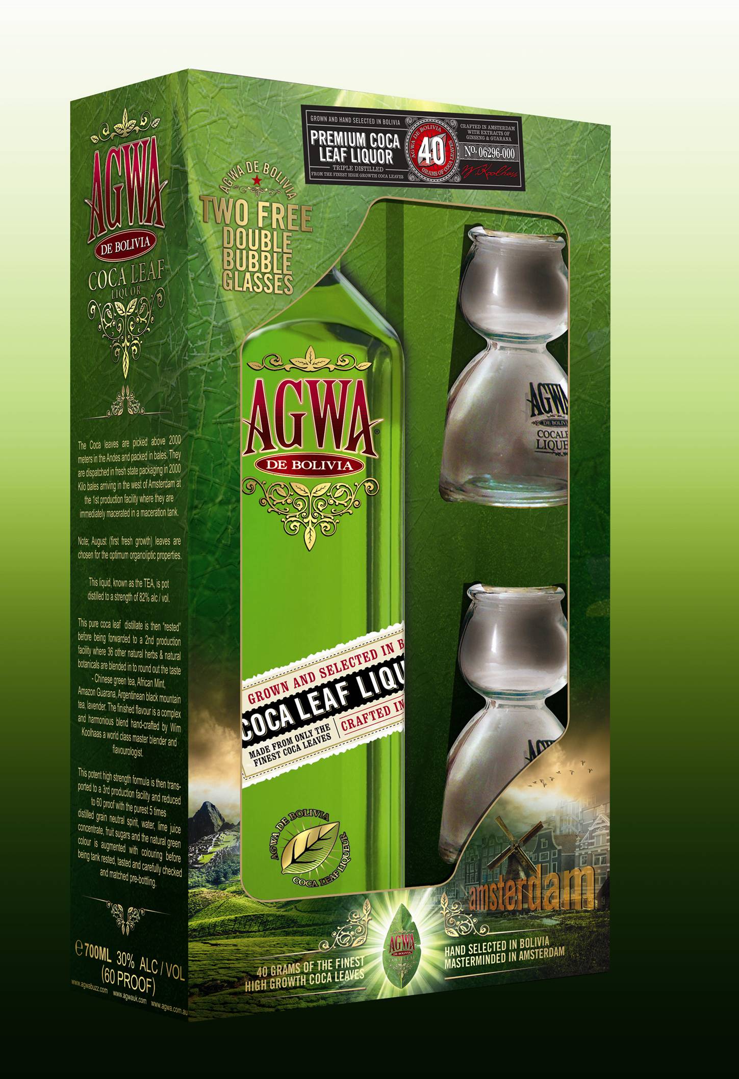 Agwa, distilled in the Netherlands, adds Chinese Green Tea, African Mint, Amazonian and Argentinean Guarana, and Ginseng to their (de-cocainised) Bolivian Coca Leaf as part of 37 different herbs and botanicals.